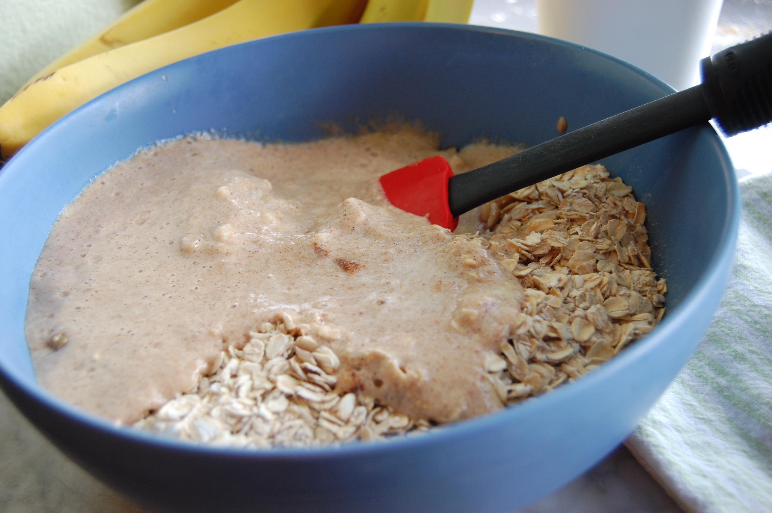 3. In a large bowl, toss the banana mix with the remaining ingredients, oats, wheat germ, orange zest and nuts.