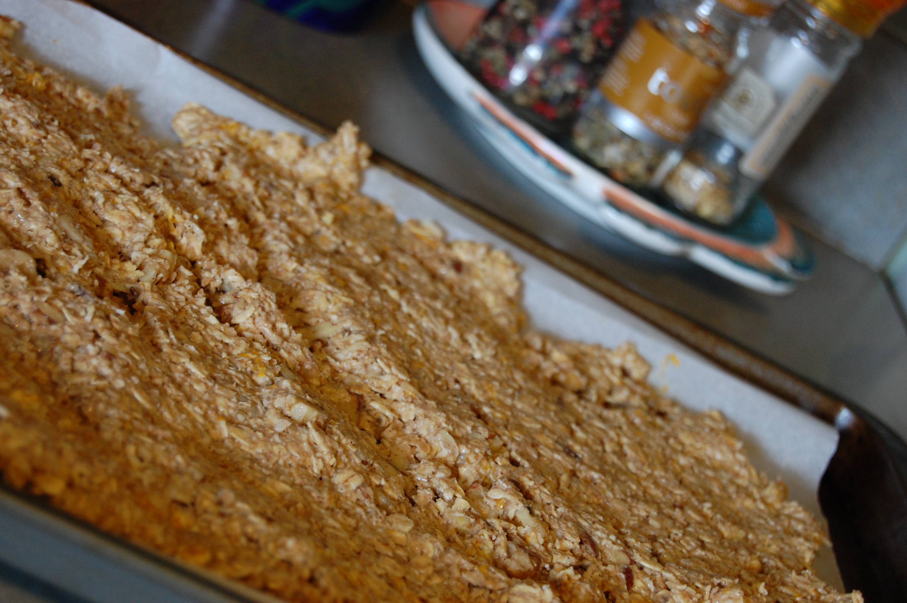 4. Lay out the mixture in a single layer on a baking tray, either non-stick or lined with baking paper.