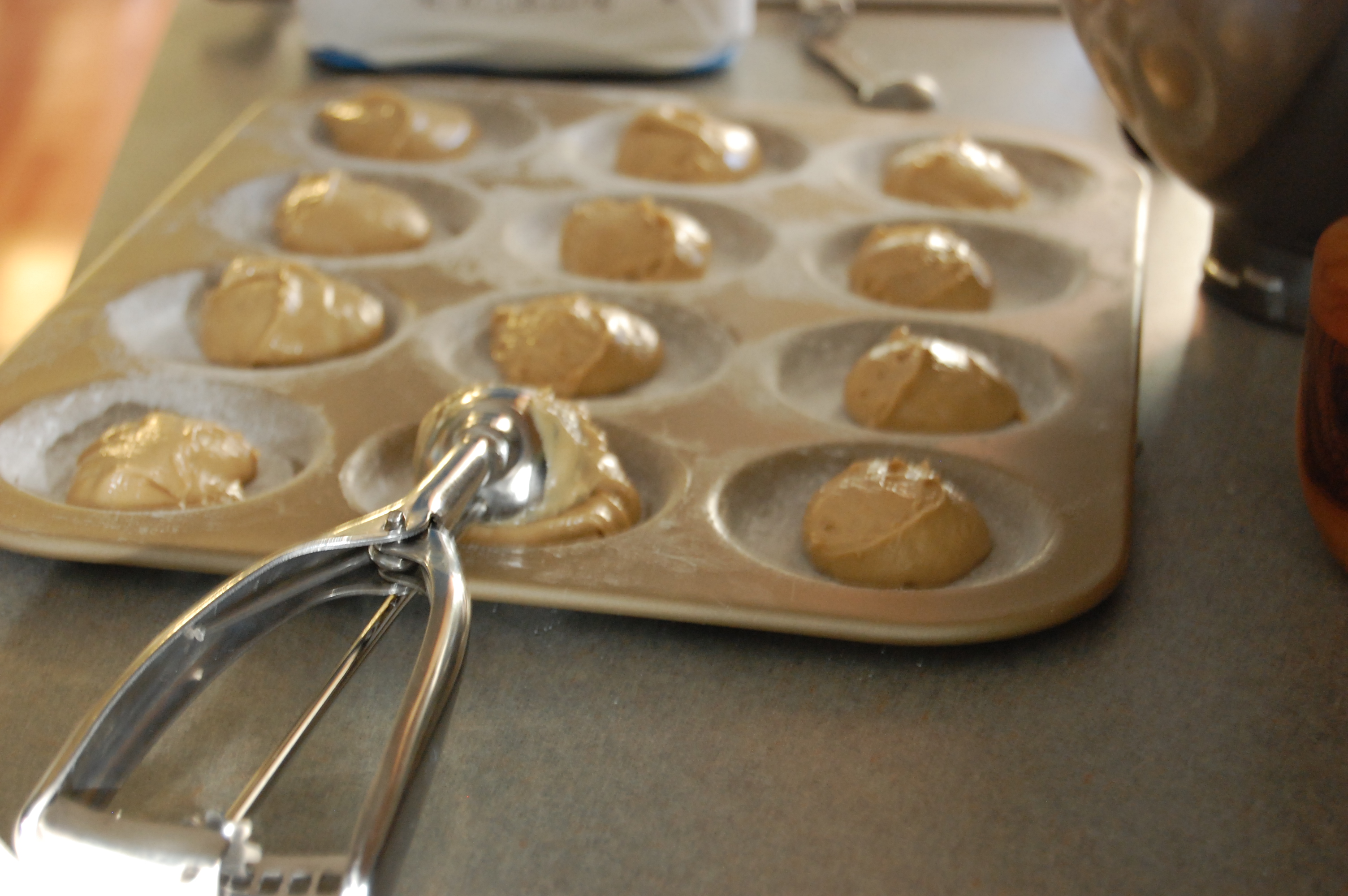 8. Drop heaping tablespoons onto the floured whoopie pie pan, I used a size 18 sorbet scoop, which worked perfectly.