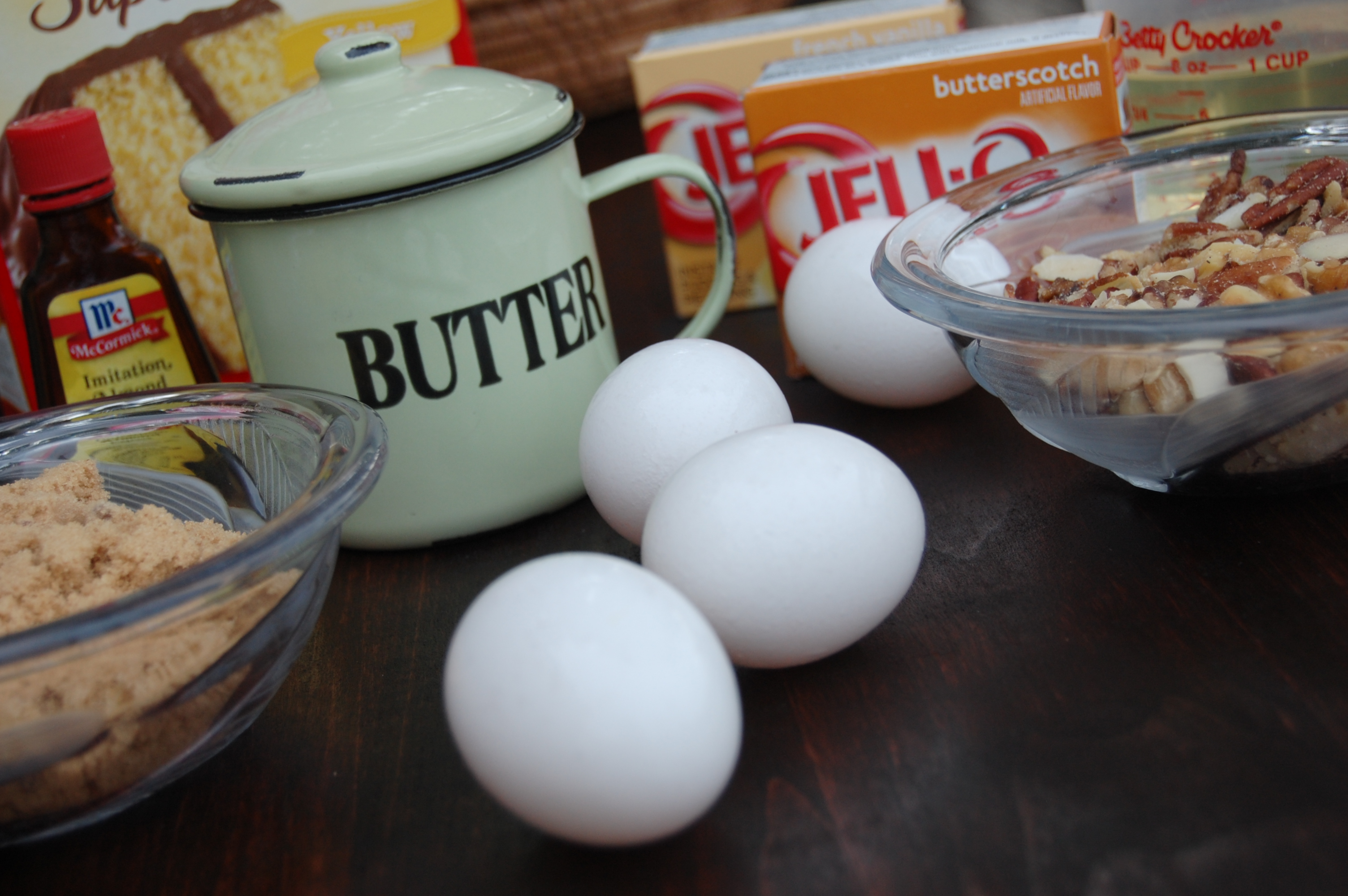 This little recipe will make you look forward to getting out of bed!  It is such a simple, quick recipe, with ingredients that are easy to keep on hand in your pantry.  This is one of the best things Queenie (my mom) made when we were growing up- I wish I could remember which neighbor or friend she got the recipe from, but for now I will credit her for the inspiration.   We grew up outside of Philly, where we had real weather compared to where I live now, in Orlando.  This Butterscotch Pecan Coffee Cake was perfect for both a chilly fall day treat and a snow day snack, unbelievably moist and delicious!