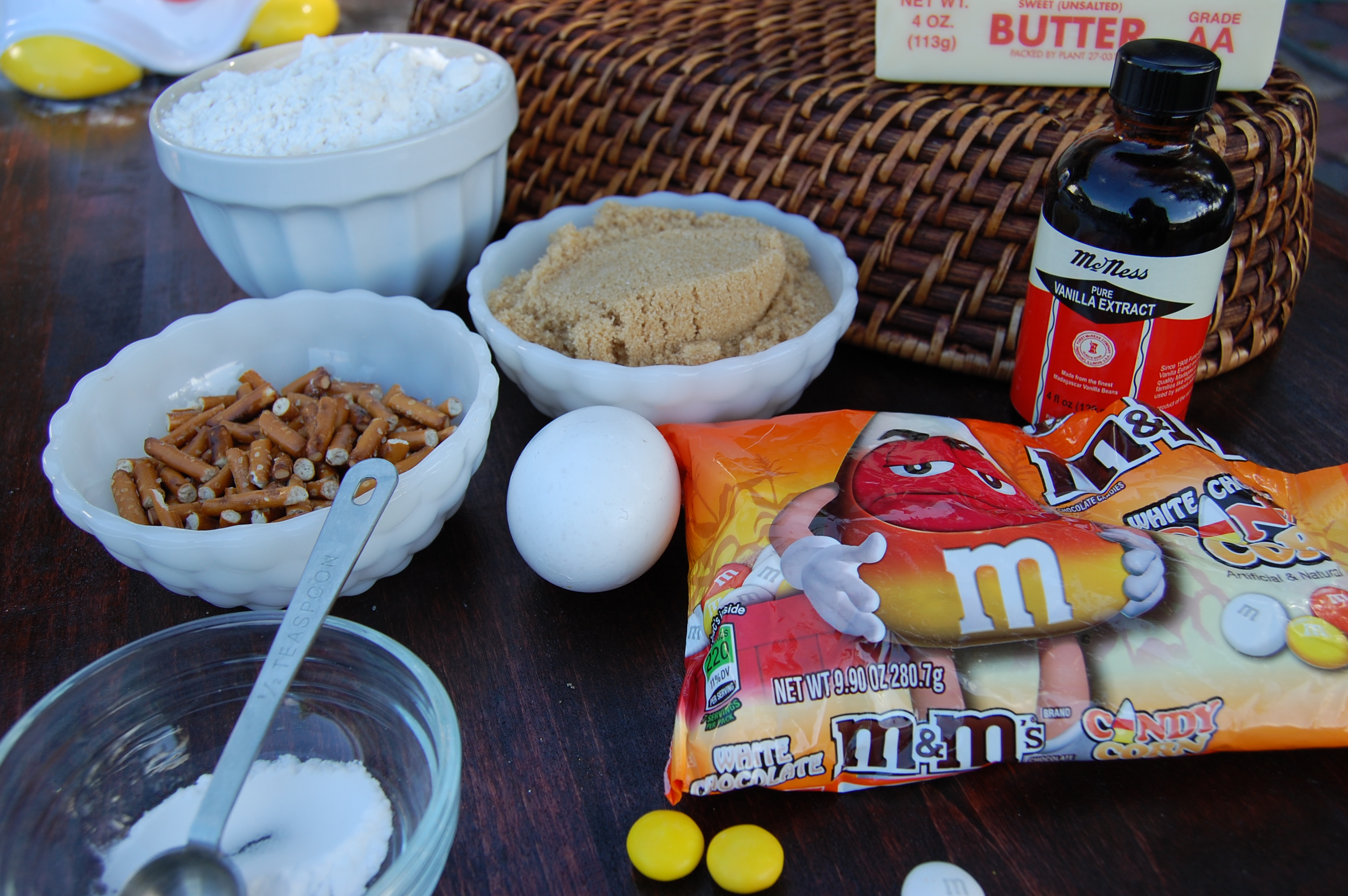 - Gently fold in pretzels and M&Ms (Reserve a tablespoon of each).