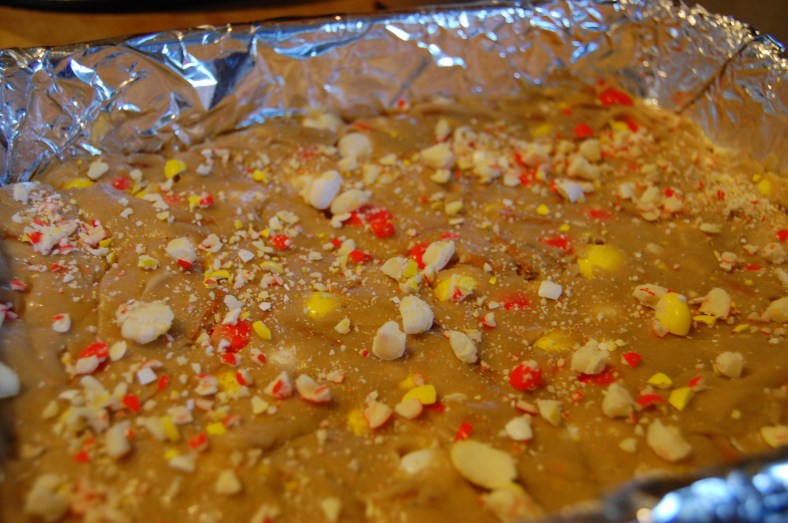 - Add batter to the pan, it will be thicker than a brownie or cake- you will have to spread the batter in the pan. Sprinkle some crushed M&M’s and pretzels over the top.