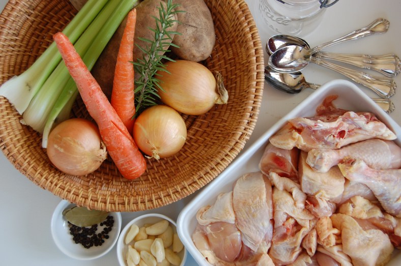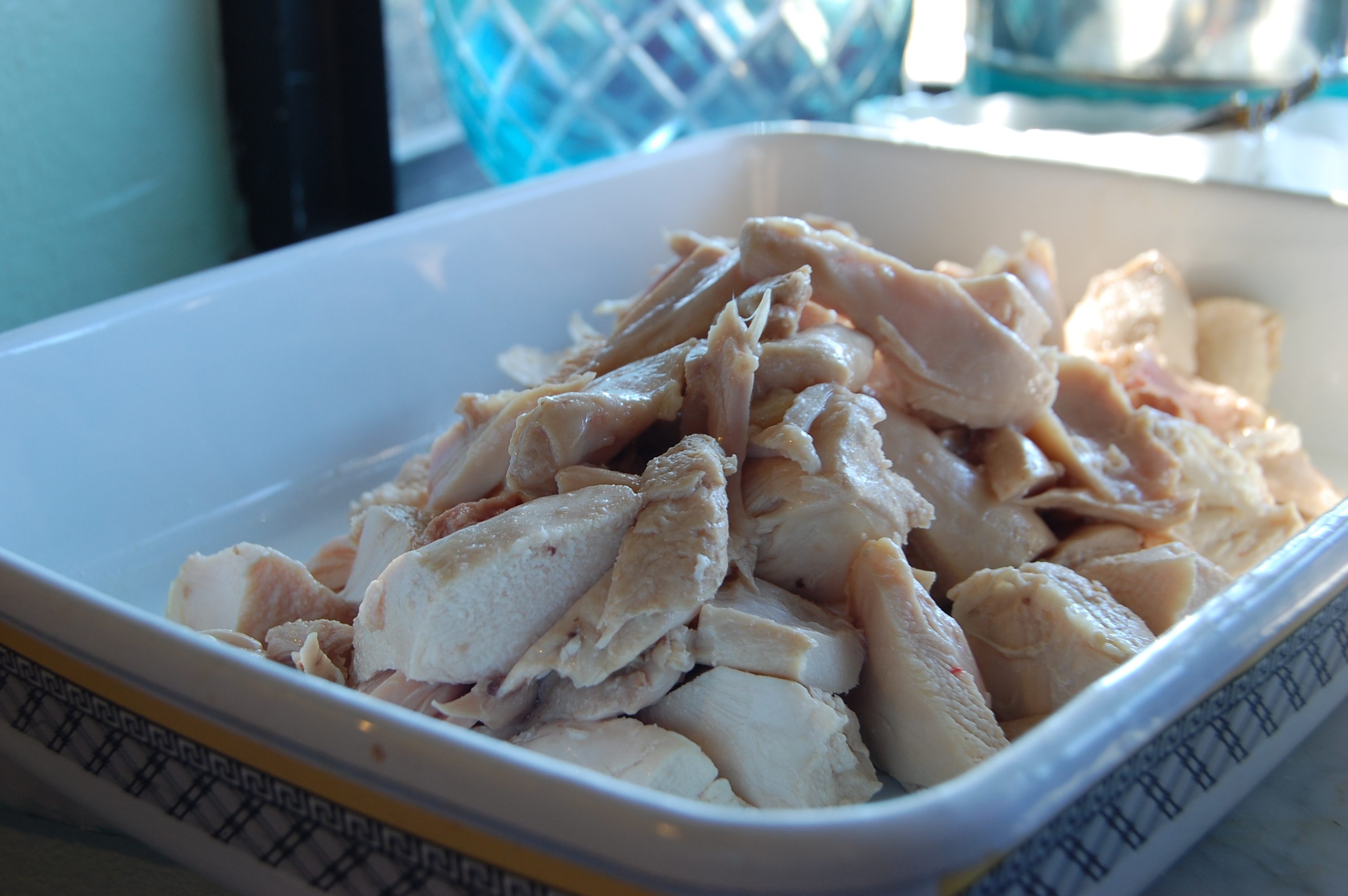 Put the chicken into a large stock pot, along with the water, vegetable, spices and the first 2 tablespoons of garlic and simmer for about 25 minutes.  Turn off the heat and remove all the chicken from the pot.  When the chicken is cool enough to handle, separate the meat from the skin and bones and return the skin and bones to the pot.  Continue to simmer stock about 4 hours.  Cut chicken meat into ½ inch pieces and refrigerate.   Strain the stock and return it to the pot, bring it back to a slow simmer and carefully skim fat off of the surface with a ladle.