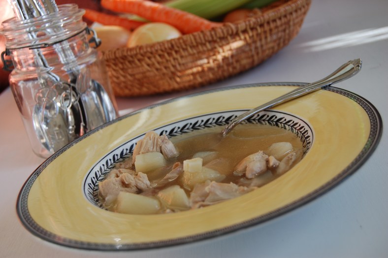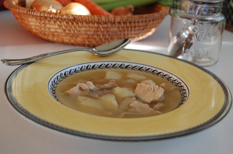 Peel and dice the potatoes into ½ cubes, and add to the pot along with remaining garlic.  Bring the stock back to a low simmer and cook potatoes until they are tender, about 20 minutes.  Add reserved cooked chicken and return the soup to a simmer.  Add salt and pepper to taste and you are ready serve.