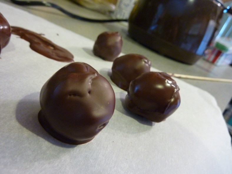 Melt remaining chocolate in double boiler.  Dip balls in chocolate and allow excess chocolate to drip off.  Place truffles on parchment paper and let the chocolate set.