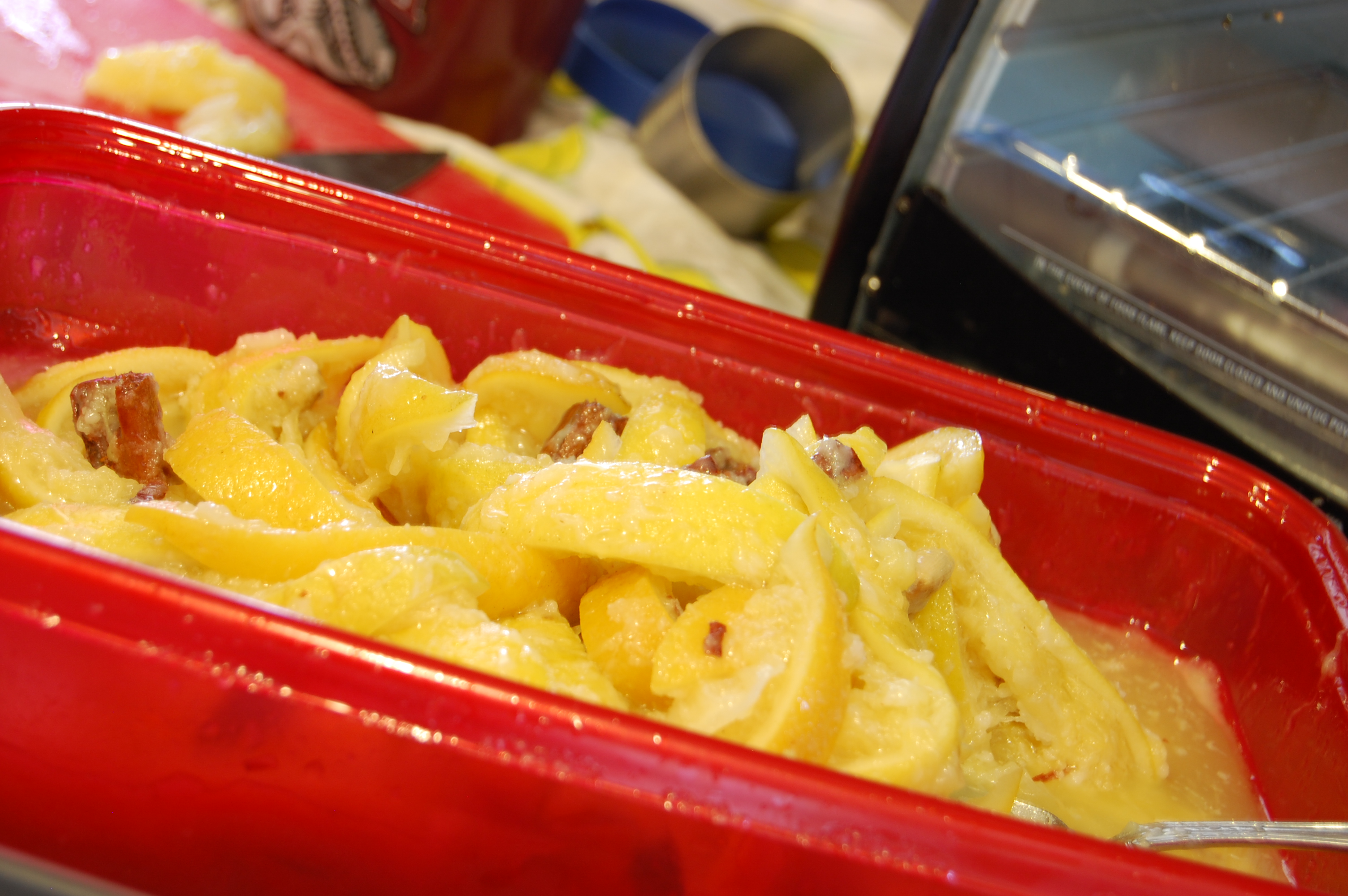 The lemons are ready!  I have been preserving lemons for the last few months and they are perfect!  I used them for the first time last week in a warm grain salad.  The best way to keep your preserved lemons is in the same container they started in.  When you are ready to use some, take out what you need, rinse the lemons off with water and remove the flesh, the skin is what you want to keep.
