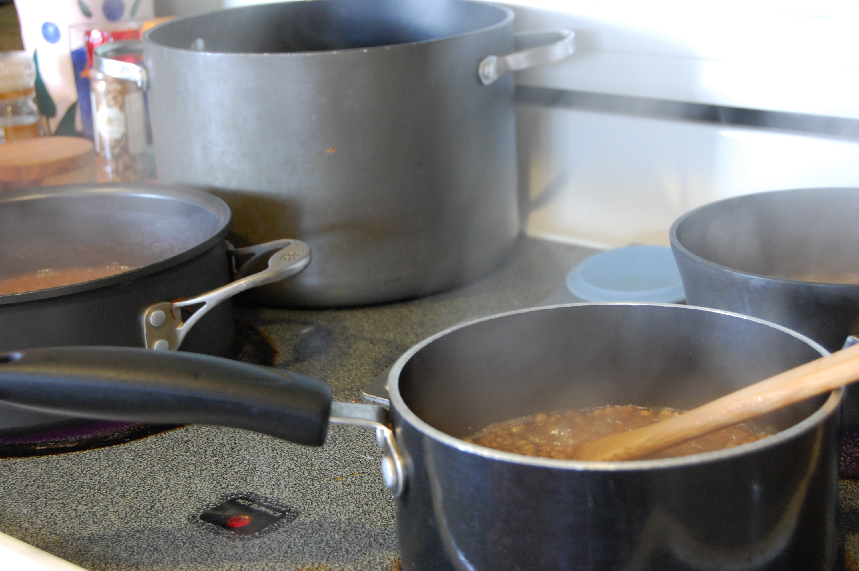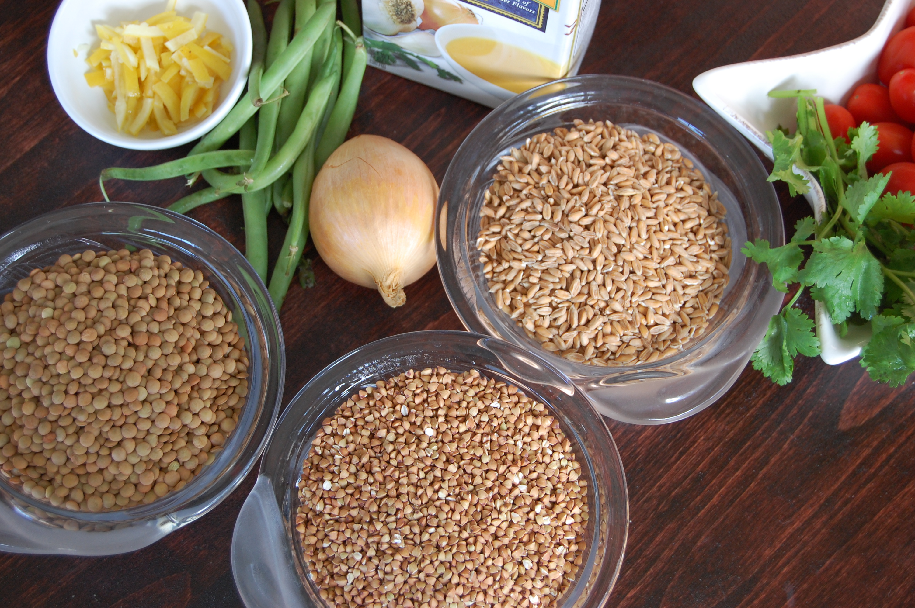 It’s pretty easy to cook grains- start by washing them off with water.  Put a pot on the stove and add the washed grains, add water or stock to about two inches above the grains.  Bring to a slow boil and cook until tender.  When the grains are a la dente, drain them from the pot with a colander.  You can cool them down and reheat them when you are ready to serve.  This is a great way to prepare meals for a busy week.
