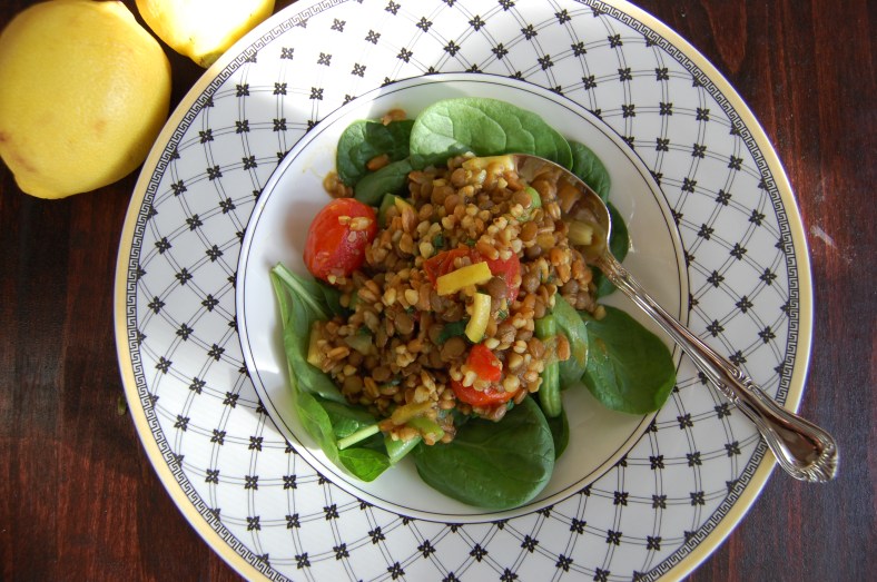 The first dish for the lemons was inspired by not having much in the refrigerator- another busy week at work.  Perfect timing to as it was Monday!  Have you heard about Meatless Mondays- I’m pretty impressed about how this initiative has gained steam.  Meatless Mondays, is a nonprofit initiative of The Monday Campaigns, in association with the Johns Hopkins’ Bloomberg School of Public Health.  Families across the country are joining in- whether their reasons are health based or financial based, 1/3 of the country has reduced their meat consumption in 2011.  Grains, tofu, soy are offering replacement proteins and a healthy alternatives.  This brings us to the popularity of grains- which can be seen all over the food magazines and in most restaurants.  Chefs are now wondering …what else can we do with grains??