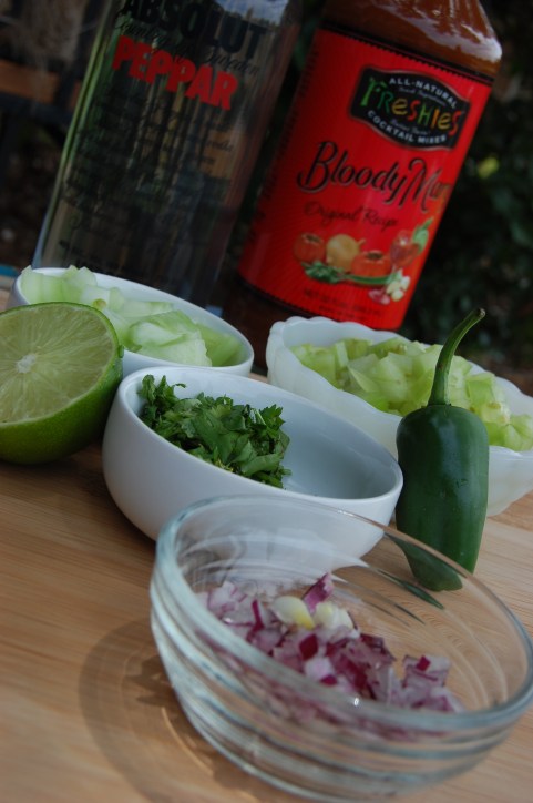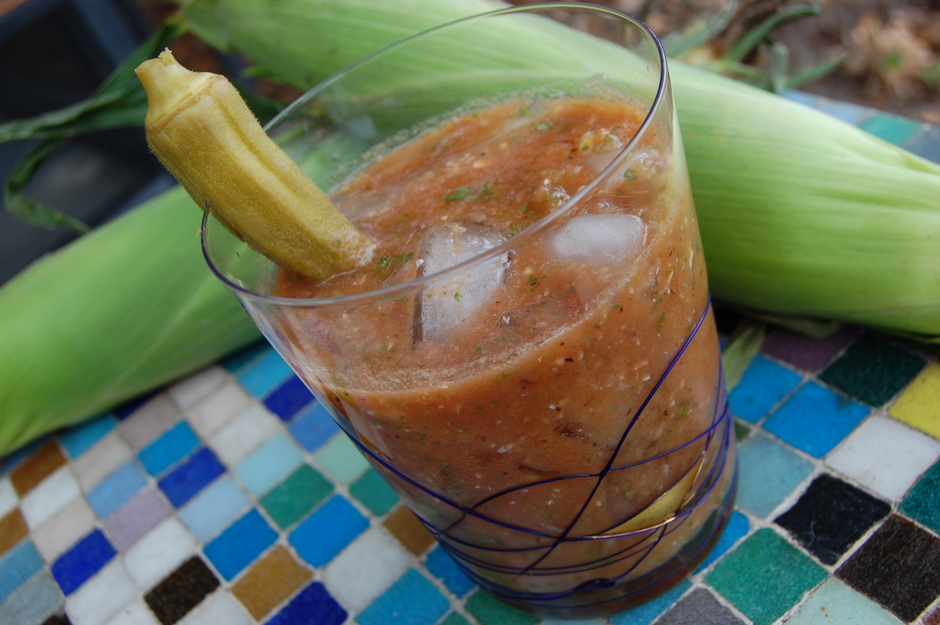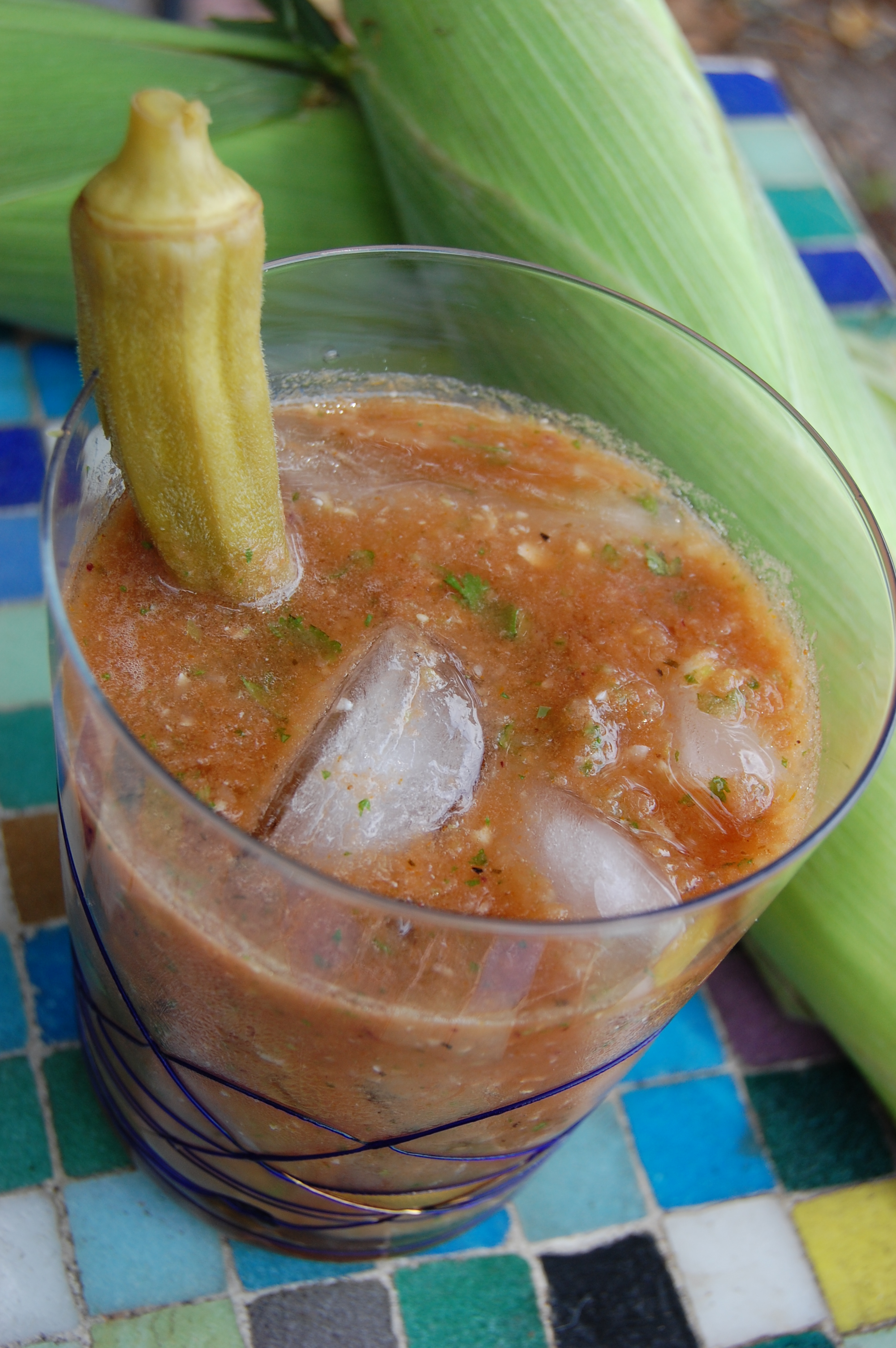 Thinking about my mom, and what I thought she might like, and what she could actually make I landed on Bloodymary Gazpachos.  The vegetables in the gardens are hitting their stride, the cucumbers are fully grown, the tomatoes are ready, we have peppers we don’t know what to do with, and corn is hitting the bins….spells out gazpacho to me.