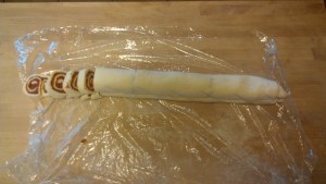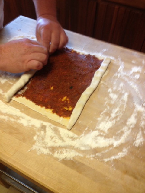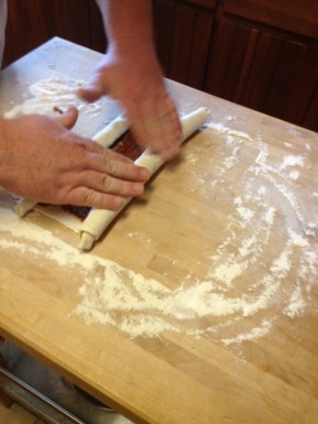 Take one sheet of Puff Pastry dough and place on a floured surface. Utilizing a rolling pin, roll to approximately 11.5” x 9.5”. Evenly spread the prepared filling over the puff pastry. Once spread, roll the pastry (using your fingers) from the top and bottom; meeting in the middle with evenly rolled ends. Compress the rolls together creating a cylindrical shape. Wrap in plastic wrap and place in the refrigerator to chill for at least 45 minutes.