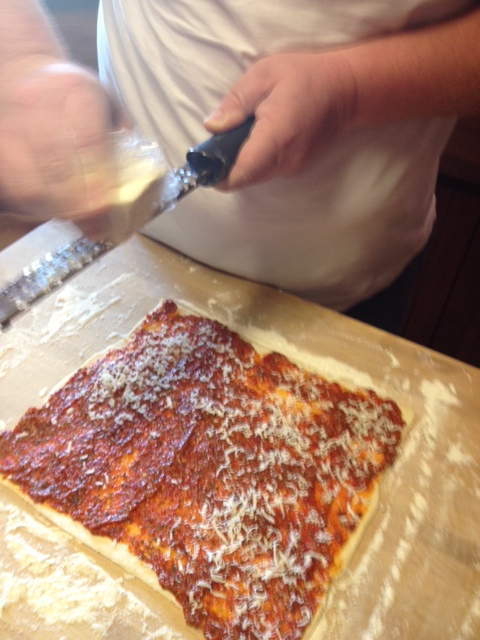 Take one sheet of Puff Pastry dough and place on a floured surface. Utilizing a rolling pin, roll to approximately 11.5” x 9.5”. Evenly spread the prepared filling over the puff pastry. Once spread grate the frozen bleu cheese evenly over the spread paste. Roll the pastry (using your fingers) from the top and bottom; meeting in the middle with evenly rolled ends. Compress the rolls together creating a cylindrical shape. Wrap in plastic wrap and place in the refrigerator to chill for at least 45 minutes.