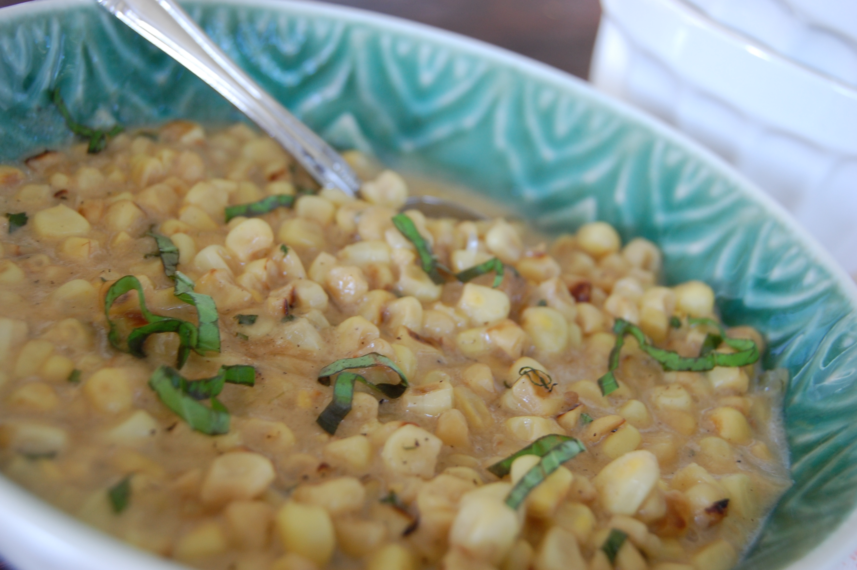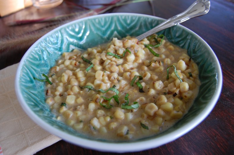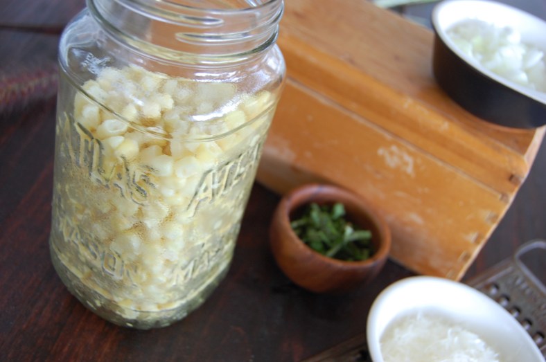 My husband, Sir Wes, took a trip to his hometown recently, Fairhope, Alabama, AKA- LA. He thoughtfully brought me back a sack of fresh Silver Queen corn from one of the local delicatessens of lower Alabama. The roads of southern Alabama are filled with stands selling the local bounty, and I, along with the rest of Alabama just love it! We had a few cobs before we had to head out of town so I cut the rest off the cob and stuck it in the freezer for another day.