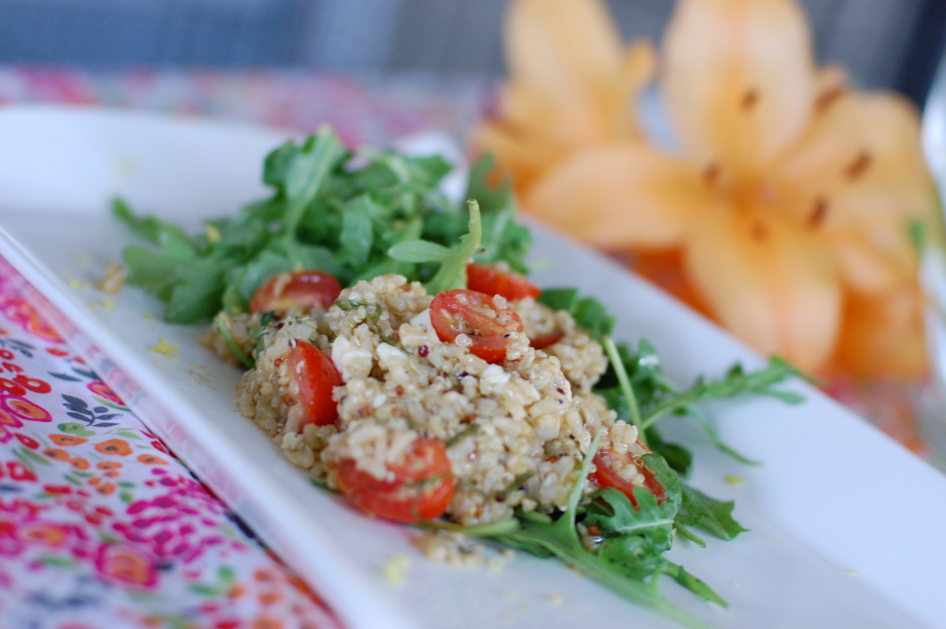 Cook the quinoa according to the packaging. While the grains are cooking prepare the vinaigrette. Combine the lemon zest, juice, vinegar and mustard in a mixing bowl. Whisk aggressively while slowly adding in the oil. After the quinoa is cooked, transfer it to a shallow container and pour ½ of the vinaigrette over the grains, mixing well. Adding the vinaigrette to the quinoa while it is still hot will help the flavor steep into the grains. Add in the onions, tomatoes, basil and feta as well, giving the chance for all the flavors to mingle and blossom. Cool the salad until ready to serve.