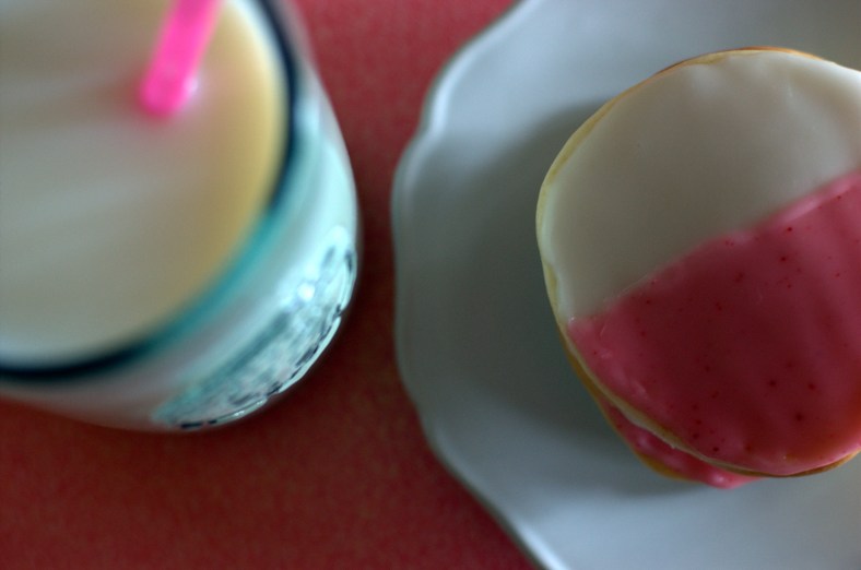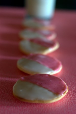 - Sprinkle Crystal Light Powder/Raspberry extract to remaining icing. Stir until smooth adding more until you reach desired shade of pink. Add additional corn syrup to thin to desired consistency, if necessary. Spread pink icing over second half of each cookie. Allow cookies to set, about 10 minutes.