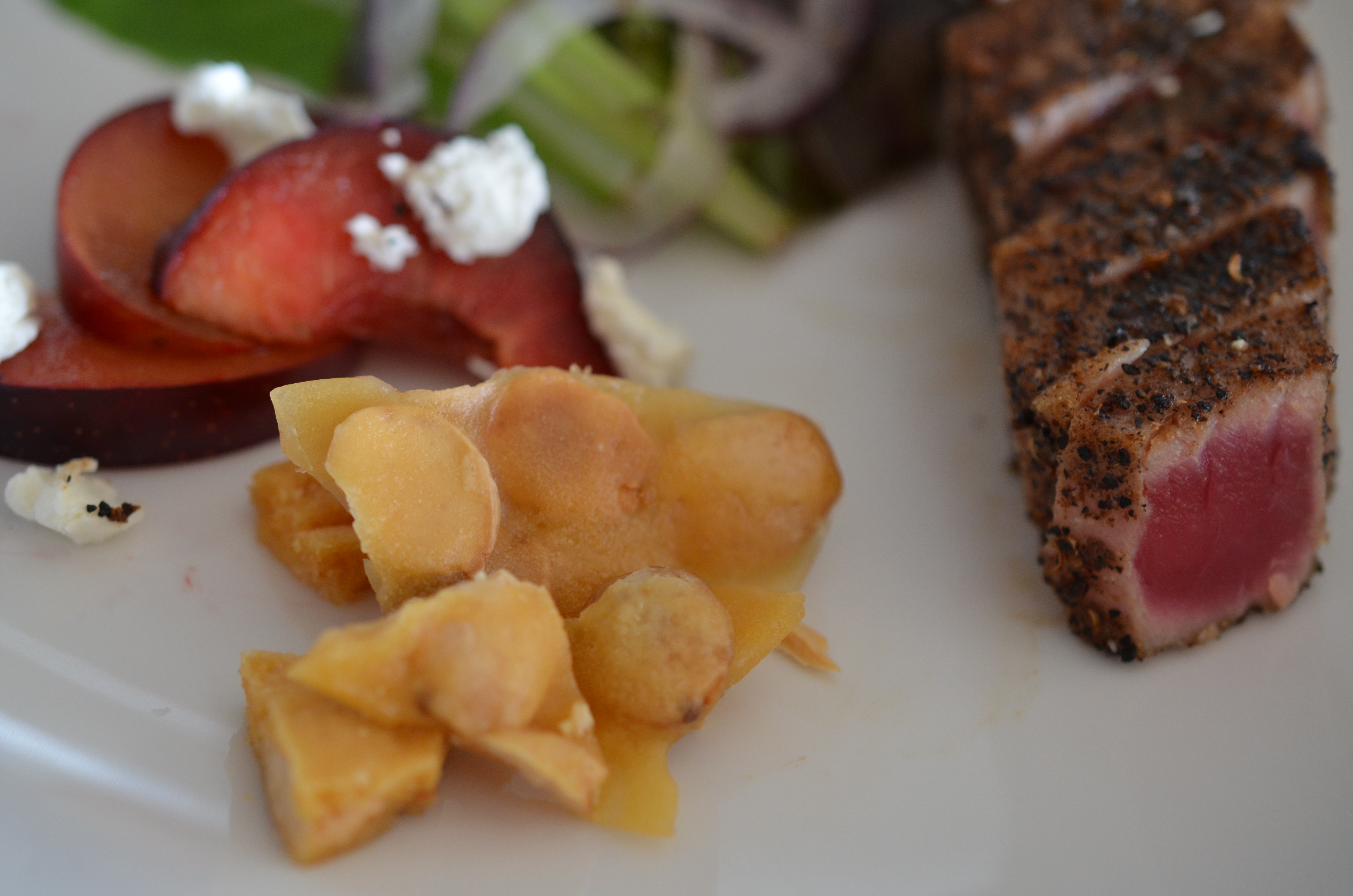 This has been on my mind ever since our inspired collaboration and thought they would be make a great addition to a salad on a brunch. I added tuna, plums and goat cheese crumbles but would also be lovely with simple greens and raspberries. You can also serve the brittle alone in a nut or candy dish.