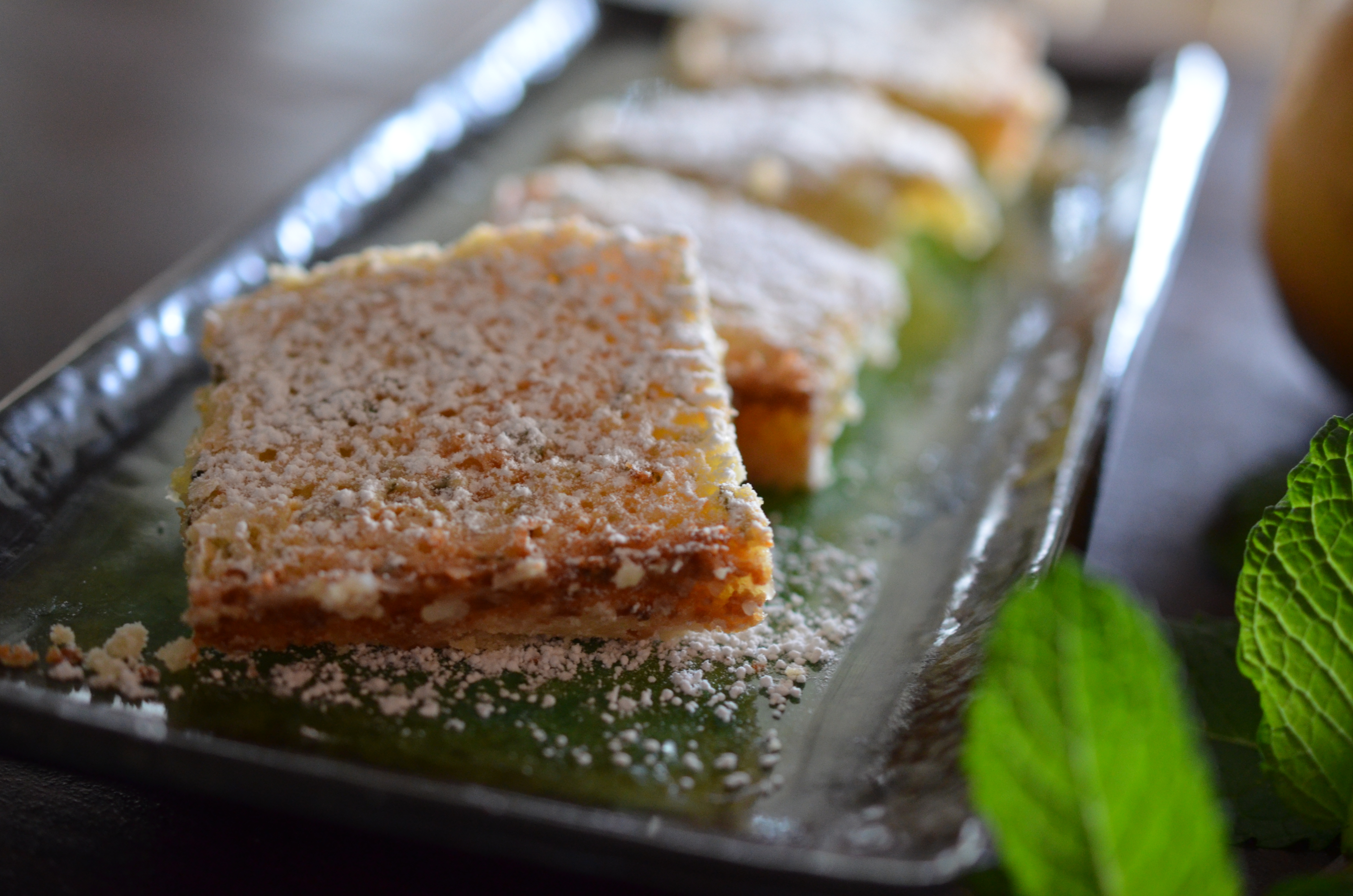 While there is nothing wrong with the classic lemon square, we are in Florida, and have a produce market right in our backyard.  Grapefruits are falling over the fence from the neighbor’s tree, lovely, bitter sweet in flavor, and our herb garden is becoming like an overgrown aromatic weed garden.  Call me inspired, Queenie’s classic lemon squares became Florida Citrus Mint Squares.