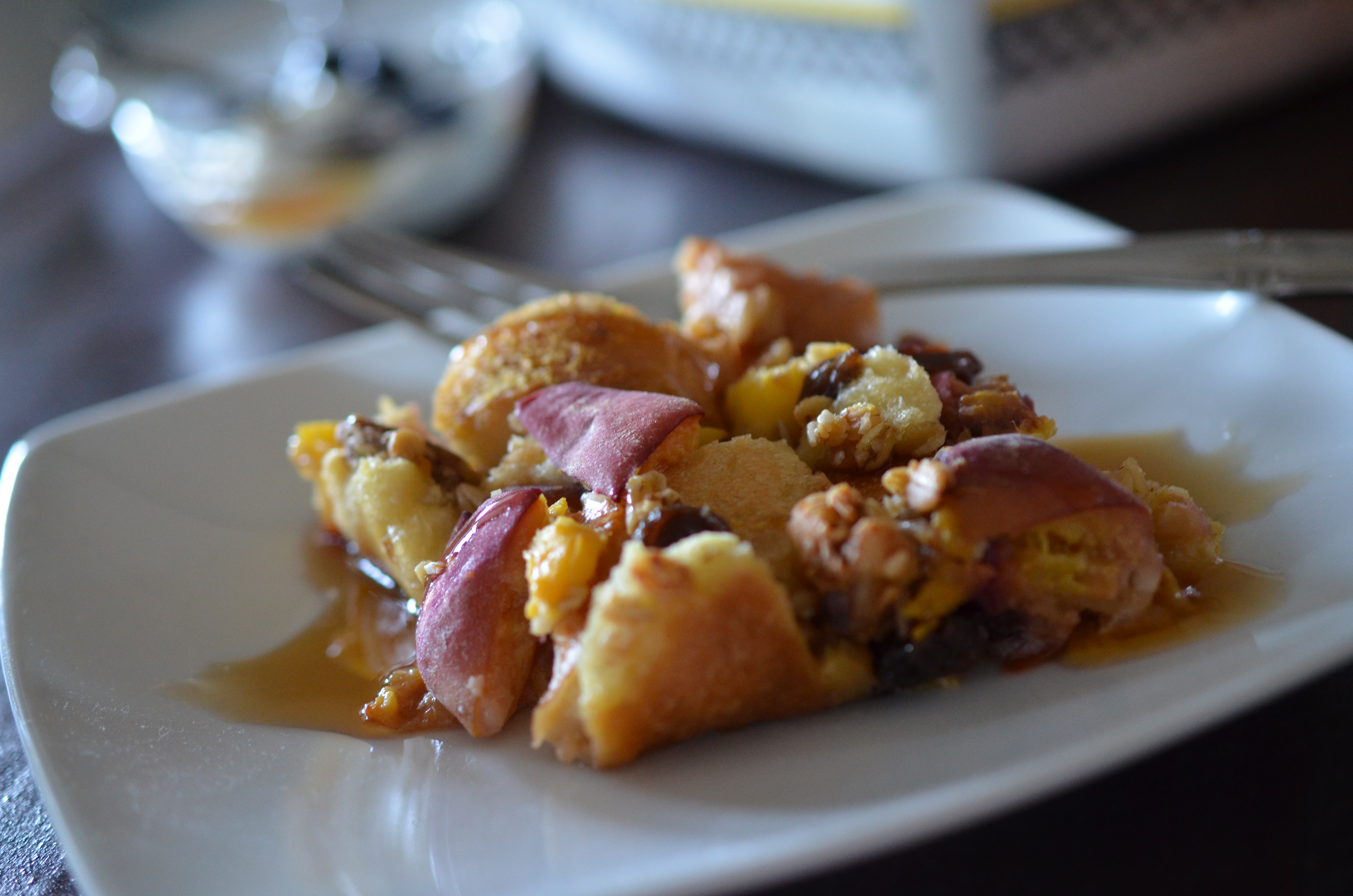So far each week I have not been able to resist the tantalizing scent of the peaches and home they come! Last week I found myself in with a familiar situation- ever had a lot of bread leftover from dinner? Or even just a half of loaf? Maybe you have even had a walk in freezer full of leftover bread. Luckily, the day old bread makes a great treat the next morning , especially when there are roasted peaches involved.