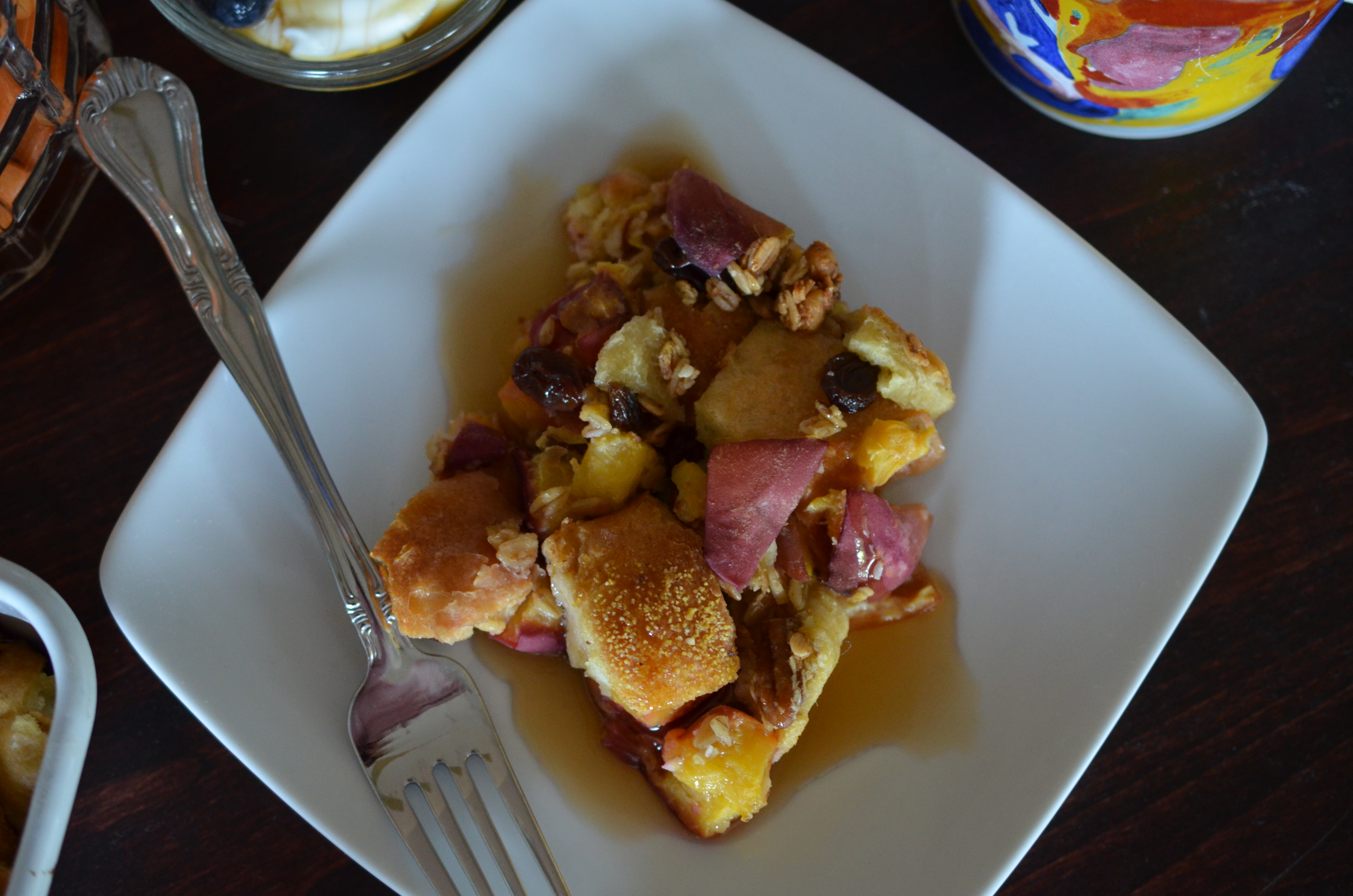 The peaches are lovely in the breakfast dish, but fresh plums and nectarines are easily substituted. Any fruit can be swapped out if you prefer. Skip the Greek yogurt and serve it as dessert one evening with a scoop of vanilla frozen yogurt.