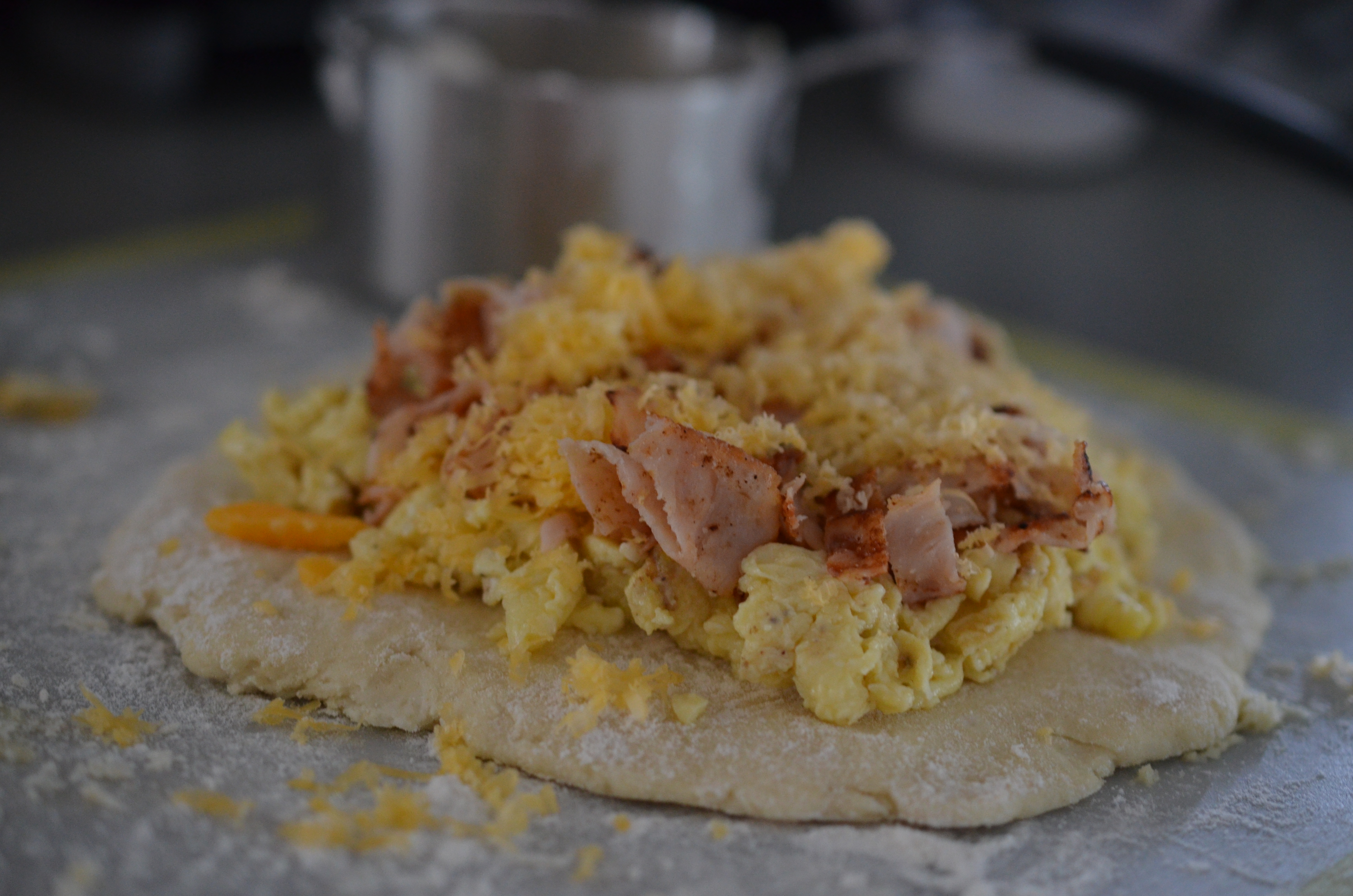Spread a ½ cup of the chilled scrambled eggs over the surface of one biscuit disc.  Sprinkle a ¼ of the turkey/ham over the eggs and then follow with an ounce of shredded cheese.