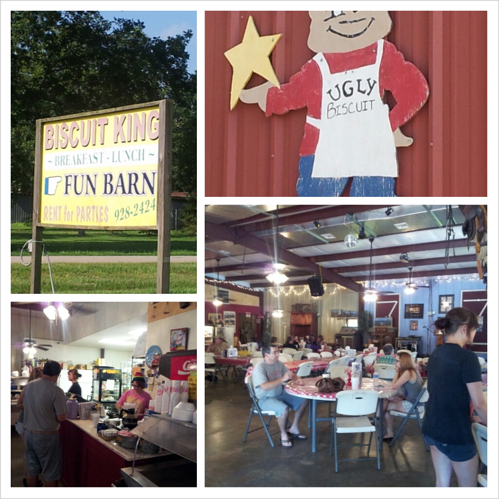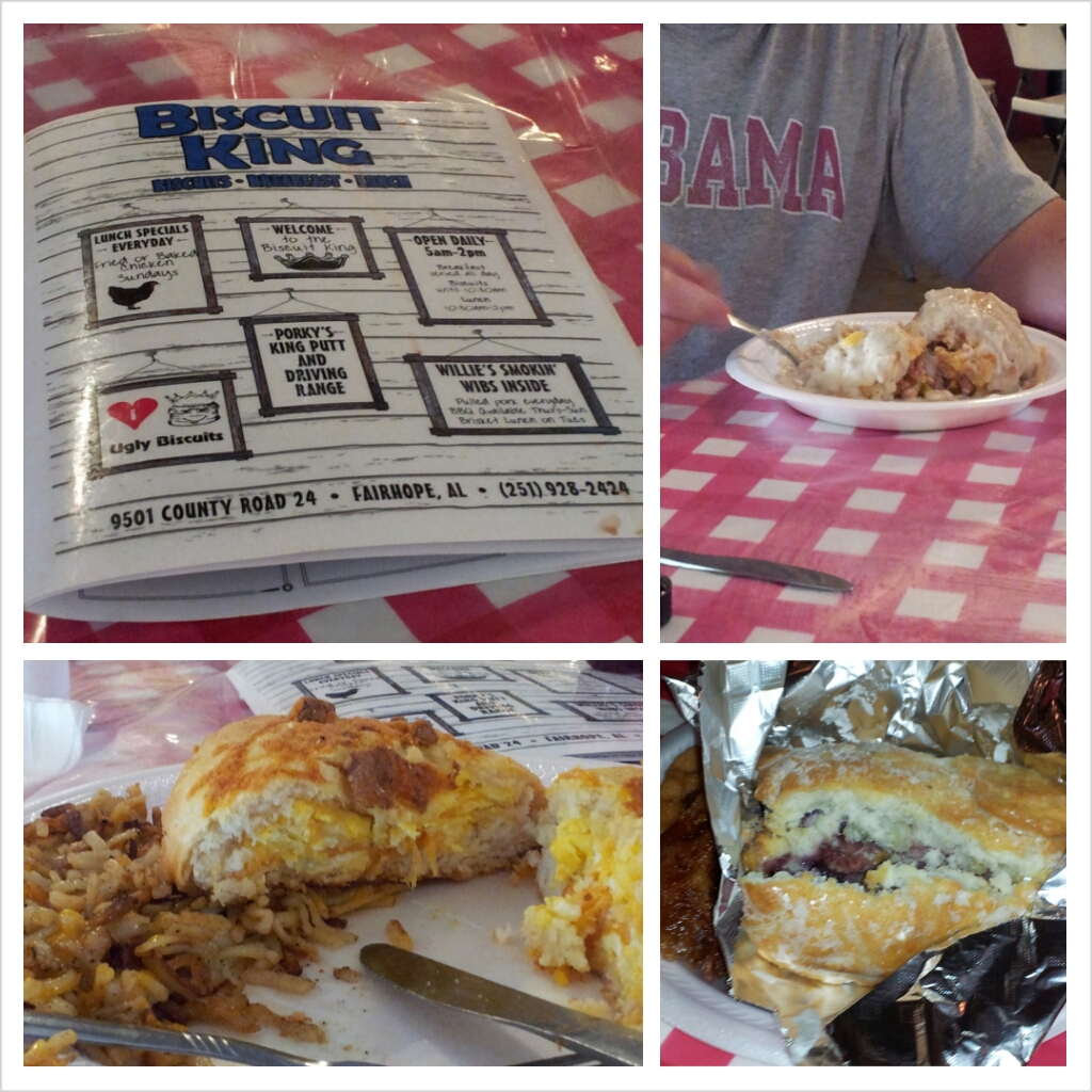 Gi-Normous, ugly and heavenly filled mouthwatering, belly aching irresistible biscuits are not to be missed on your next trip to LA (lower Alabama).  And they are born and raised all within view of the curious diners.  We visited the home of these ugly treasures, called Biscuit King Cafe in Fairhope, Alabama felt like we stroke gold, and as mentioned above, a small belly ache from over indulgence.   This small family business has something going for sure.