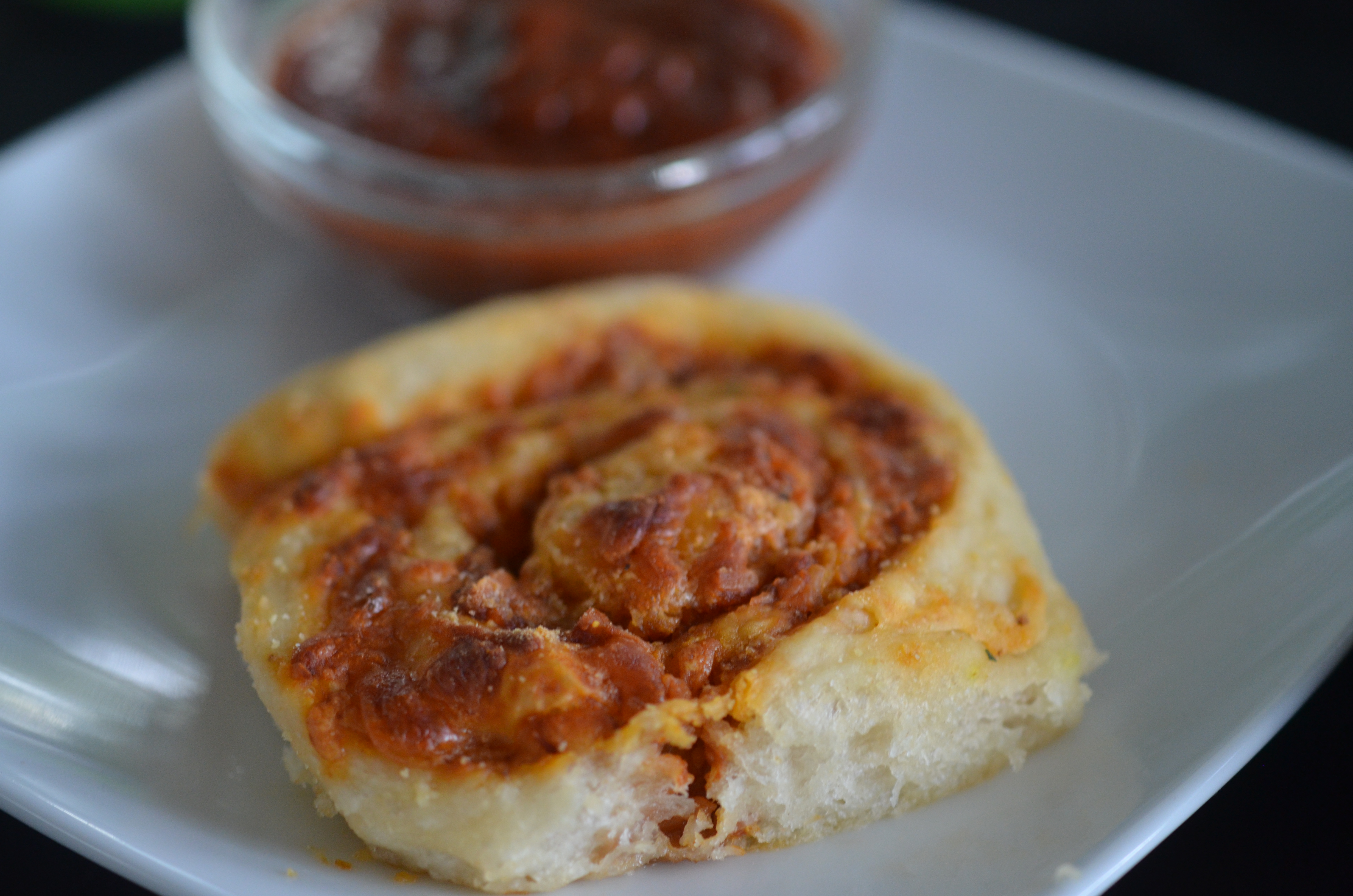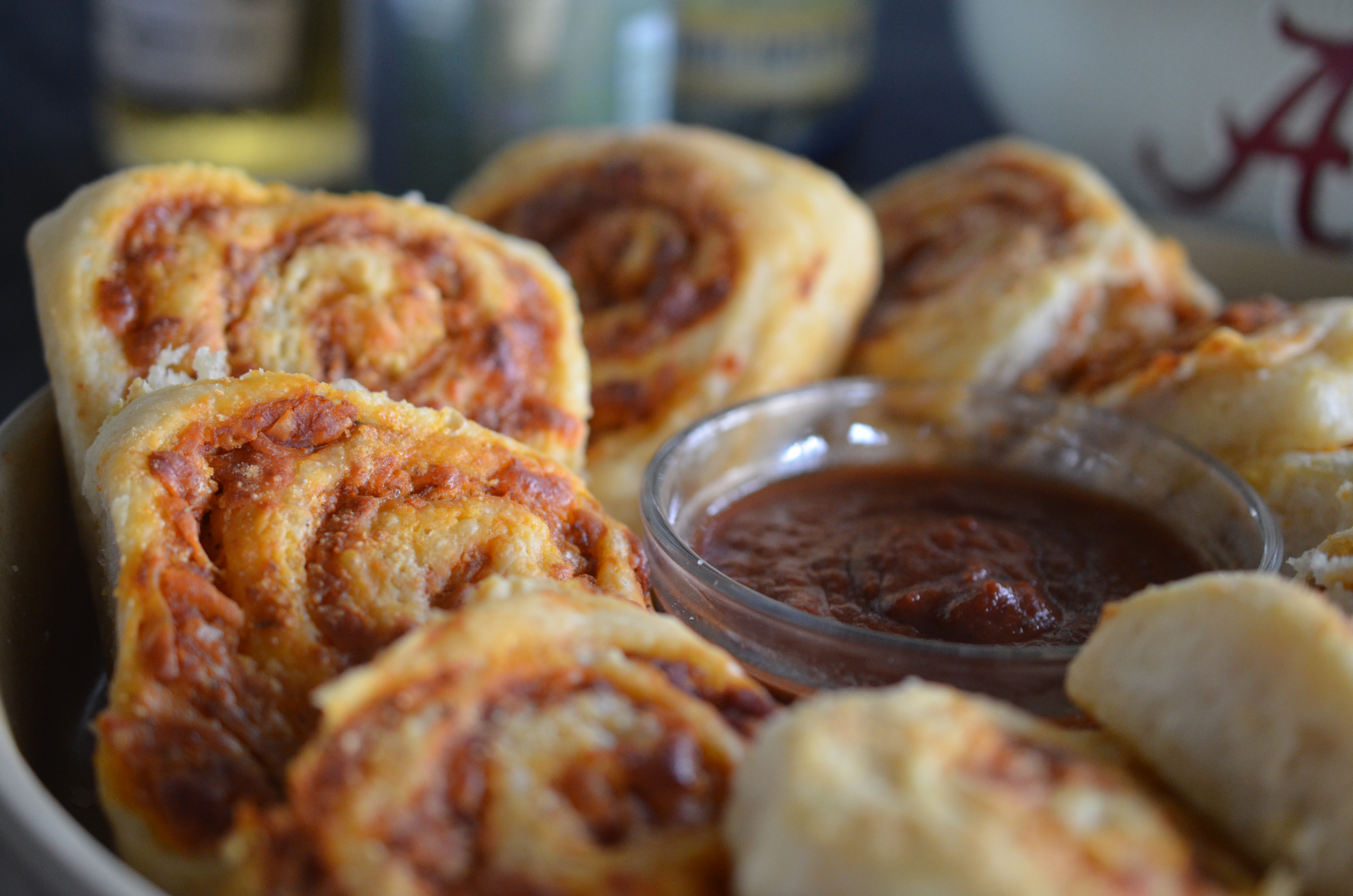 Make pizza crust according to directions and let raise once. After it has risen, turn it onto a counter sprayed with cooking spray and roll it out thin, in the shape of a rectangle. Spread sauce; you may only need 1/2-3/4 cup but you can use the rest for dipping after the rolls are cooked. Add cheese and start rolling the dough tightly in a neat line. When there’s about an inch of dough left, stop rolling and pull the edge up and over, pinching it closed.