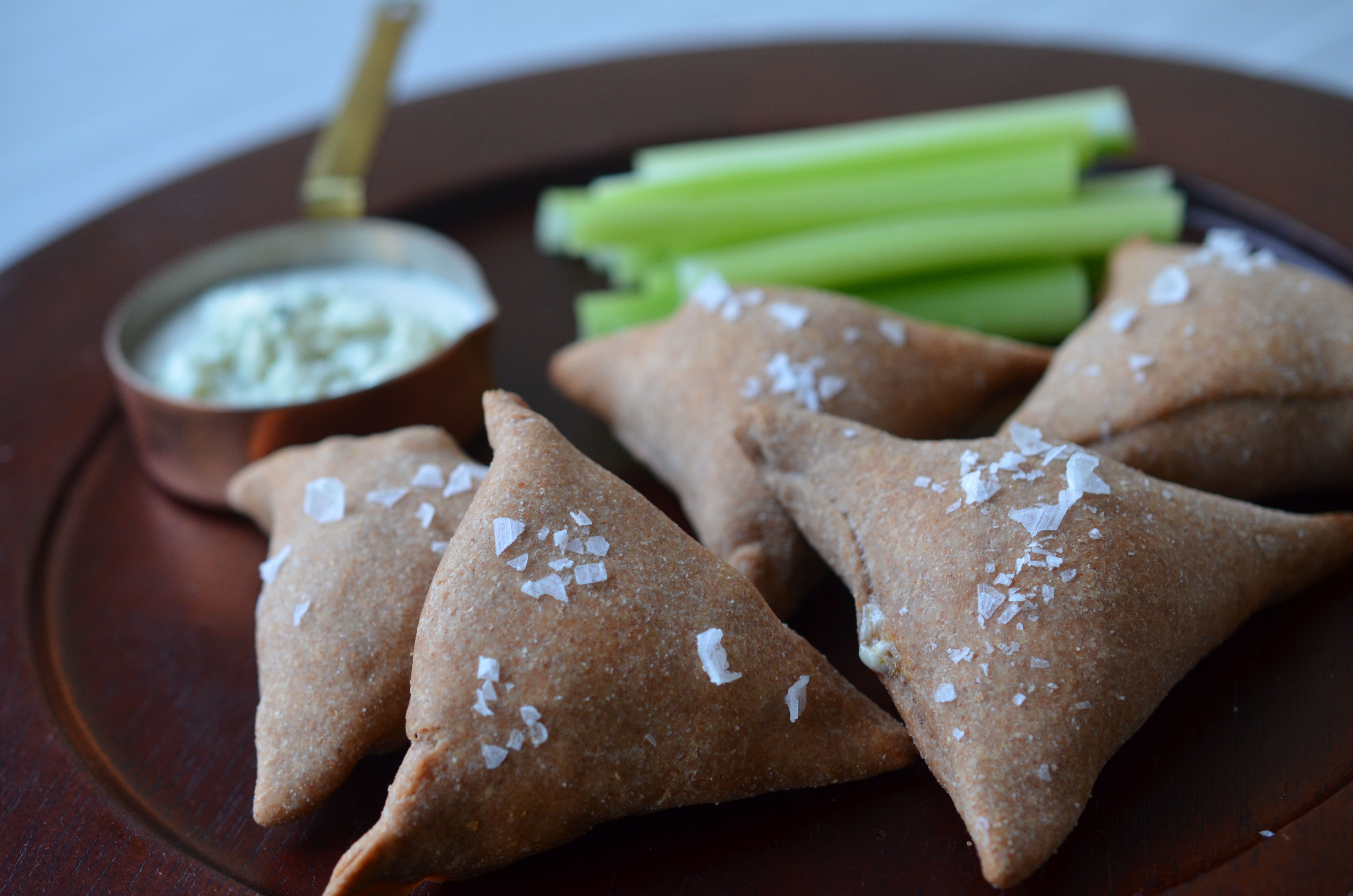 Divide the dough into 4 sections and form each into a smooth ball. Using your hands, press each ball into a flat disk. Dust a clean working surface with flour so the dough doesn’t stick, and using a lightly-floured rolling pin, roll a disk into a thin circle, thick as a tortilla and cut the circle in half. Take one of the half circles and make a cone shape starting at the center of the cut side to make the point of the cone and then wet the edges with a little water to bond the overlapping the edges together. Put 1-2 oz of filling into the cone, moisten the top of the inside edges and close the cone, pressing the edges to seal it. Brush with olive oil on each side of the samosa and then place it on a baking sheet. Repeat the process to make about 12 samosas. Sprinkle with sea salt and place the samosas in the oven, and bake for 20 to 25 minutes, or until the samosas are nicely browned. Serve with the blue cheese dressing.